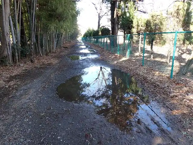 ふれあい道路を取手方向から来て、常盤道跨線橋を渡る直前の右の側道を入り、右折した箇所のドウロは、舗装されておりません。道路のえぐれがひどく、雨のあとは大きな水たまりが続き徒歩、車椅子、自転車の通行できまん。水のないときでも、表面は凸凹で通行に不便です。道路を舗装してください。またここは両側に木が茂っており晴天でも暗いです。木の伐採をお願いします。